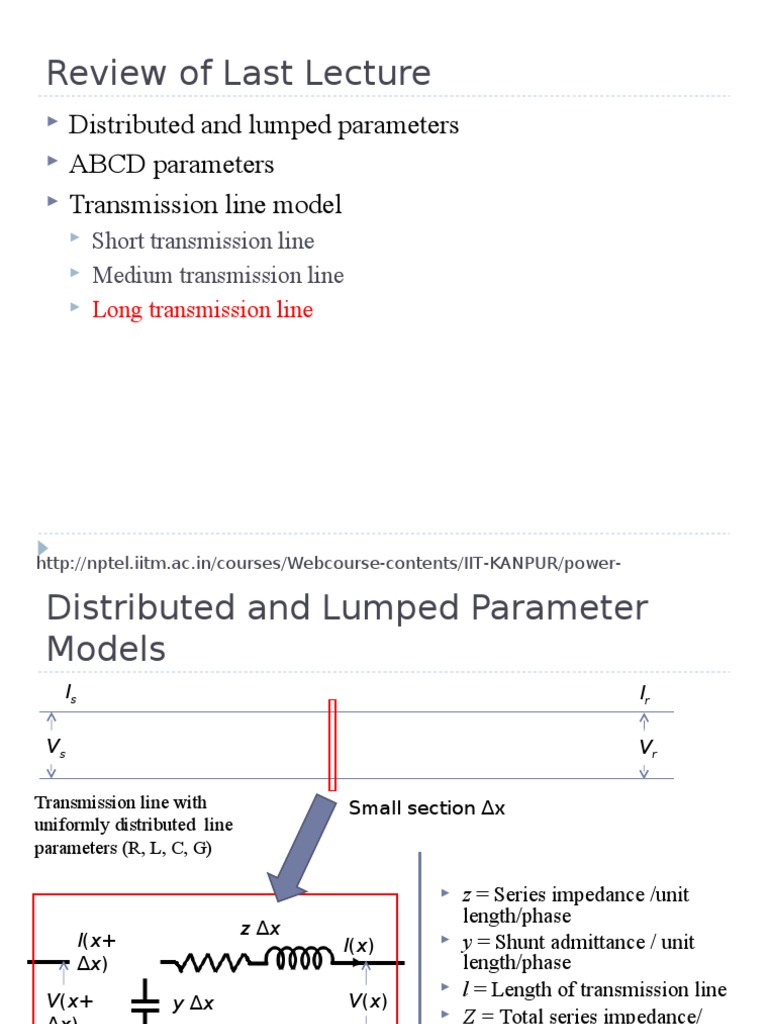Review of Last Lecture: Distributed and lumped parameters ABCD parameters Transmission line model | Transmission Line | Electric Power Transmission