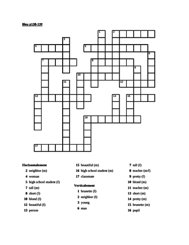 Bleu Unit 4 Lecon 9 Pages 138 139 Crossword Teaching Resources